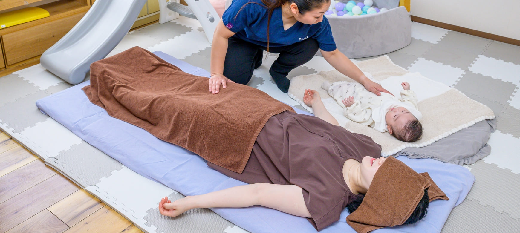 施術中におむつ替えや授乳が必要になった場合でも、無料で施術時間を延長して対応できます。※次の移動先がある場合、無制限ではありません。施術中におむつ替えや授乳が必要になった場合でも、無料で施術時間を延長して対応できます。※次の移動先がある場合、無制限ではありません。